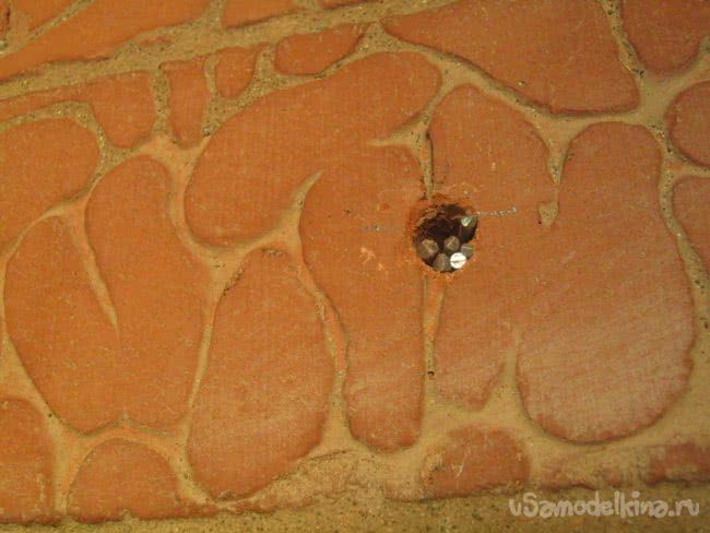 Дождавшись полного высыхания, привинтил поручень на место. Пользовался обычным приемом для бетонных поверхностей – провертел глухую дырку, вставил дюбель, завернул шуруп. Разметил места для отверстий – приложил поручень на место, выровнял его относительно ближайших горизонтальных швов и по краям печи, сквозь отверстия поставил карандашиком метки. Отверстия сверлил на невысоких оборотах. Хорошо работает тот же перфоратор в режиме сверления. Красный кирпич просверлил стандартным буром. Режим долбления не стоит применять – глиняный раствор не так уж и прочен, а сверлится кирпич удовлетворительно.