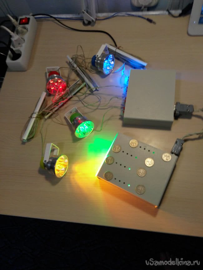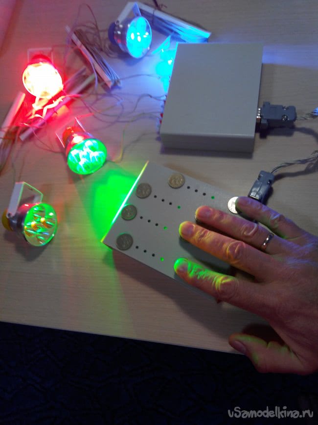 В праздники придумал и изготовил сенсорную светомузыкальную игрушку для своей дочурки. Ей 8 лет и пора не только слушать музыку, но её и разукрашивать. С помощью 5-ти копеечных монет на пластиковой коробочке (монетки являются сенсорами) при касании, происходит загорание соответствующего цветного светодиодного 5-ти ватного светильника.