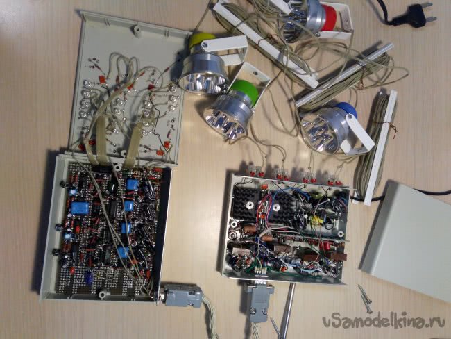Очень быстро, с помощью такой незамысловатой самоделки, дочь показала мне как у неё развито чувство ритма. Указательный палец управлял каналом с красным цветом, средний каналом с зелёным цветом, безымянный каналом с жёлтым, а мизинец управлял каналом с синим. Получилось очень прикольно и красочно, но нужна тренировка пальчиков....