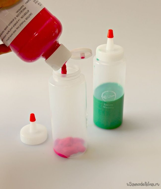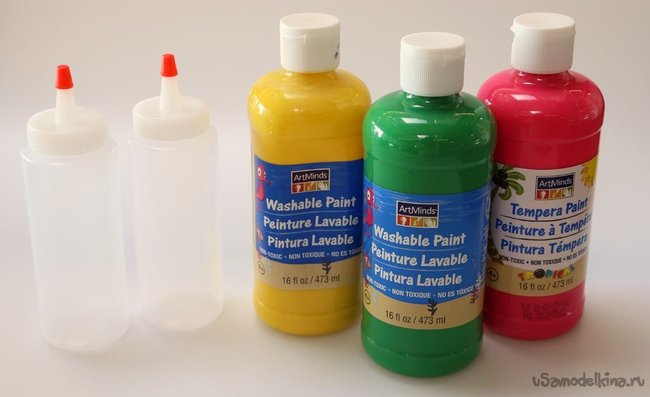 Я использовал парочку мягких бутылочек с узким носиком, наполнил их темперой - смываемой, безопасной для детей краской. Эти бутылки будут использоваться как аппликаторы для нанесения краски на лист. Я разбавил немного краску водой, чтобы получилась более жидкая консистенция.