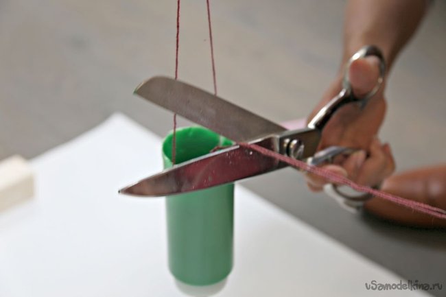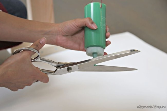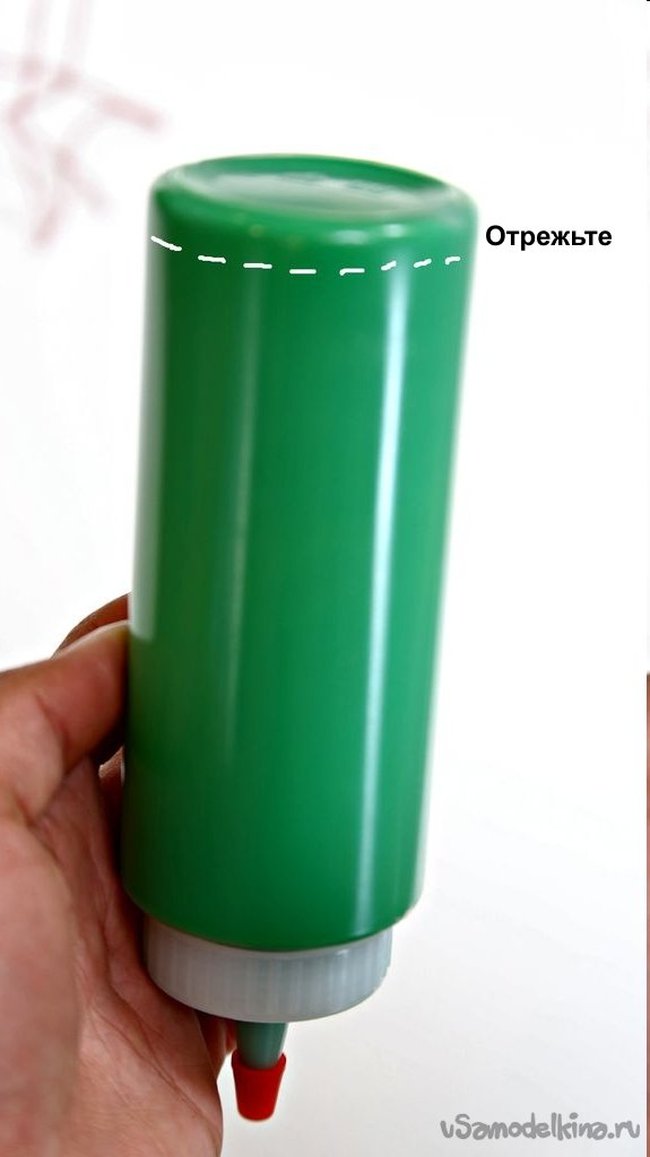 Далее я срезал дно мягкой пластиковой бутылки, и проделал два небольших отверстия в стенке бутылки, на расстоянии 1 см от отрезанного края, напротив друг друга. В эти два отверстия проденется нить.