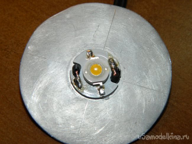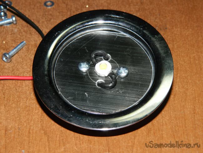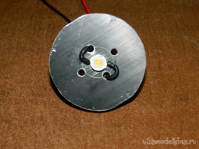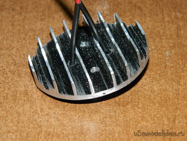 Боковое отверстие служило для выводов питающих проводов. Светодиоды стояли на тех же монтировочных пластинах Ø15 мм и были посажены на термоклей. После высыхания клея (12-24 часа) распаял подводящие провода.