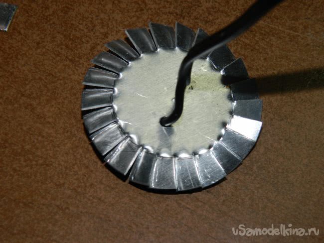 Ещё я пролетел с радиаторами — обыкновенные алюминиевые пластина. Чтобы стекло не касалось светодиода в лампе, пластины были надрезаны и «вогнуты» внутрь.