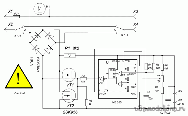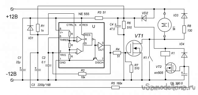 Но изображенная схема хорошо работает при ручной регулировке, для нашей цели – плавного пуска – лучше использовать таймер NE555 (далее просто таймер), «заточенный» именно под такие режимы. Отечественный аналог КР1006ВИ1, другие аналоги: Philips - EGG955M, Maxim - ICM755, Motorola - MC1455/MC1555, National - LM1455/KM555C, NTE Silvania - NTE955M, Raytheon - RM555/RC555, RCA - CA555/CA555C, Sanyo - LC7555, Texas instruments - SN52555/SN72555. Полное описание приводить смысла нет, есть справочники, но суть в том, что у него есть вход «Контроль» (CTRL), 5 ножка микросхемы. Вот описание с «Радиокота»: