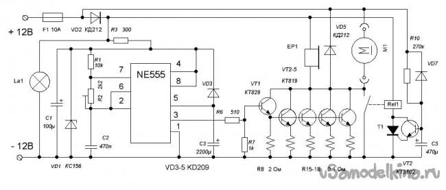 При движении назад плюс и минус меняются местами, питание 555 отсекается диодом VD2. Ток двигателя проходит через встроенный в полевик VT1 диод, у которого допустимый ток такой же, как и у основной структуры. Включенный последовательно с демпферным диодом VD3 резистор R8 мало влияет на его демпфирующие свойства, но защищает его от перегрузки при реверсе. Таймер здесь включен по нетиповой схеме, деталей меньше, функции те же. Питание на таймер подается через резистор R3 не только для улучшения фильтрации питания, а в основном для создания превышения напряжения на 5 ноге над напряжением питания таймера для «затыкания» его в нужном нам положении. Номинал его при использовании аналогов таймера может сильно отличаться из-за разного тока потребления. Резистор R6 и диоды VD2 и VD4 – для разрядки времязадающих конденсаторов С3 и С5 при отключении питания. Для устранения паузы в начале трогания между минусом С3 и минусом питания может устанавливаться не указанный на схеме подстроечный резистор порядка 1 кОм, настройка индивидуальная. Используется в описываемом изделии. Частота генерации определяется С2 и R2, при этих номиналах примерно 300…500 Гц, звуковой иммитатор дает приличную иммитацию разгона. Для более плавного разгона C3 можно увеличить до 4700,0 мкФ.