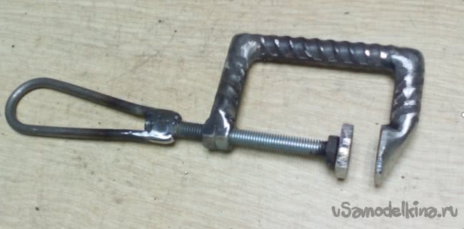 Струбцина почти готова осталось только сделать рукоятку. Есть разные варианты с воротками, барашками, ручками. Можно сделать с ручкой в виде душки. Стальному прутику придать нужную форму и приварить к винту.