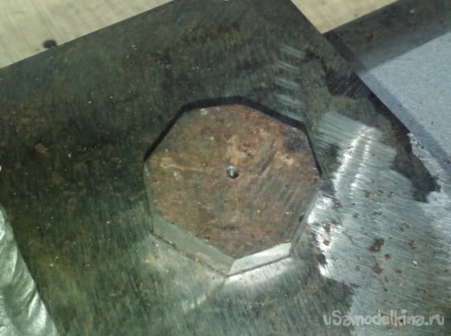 Чтобы расклепанный винт свободно вращался и не выступал за шайбу рассверлим отверстие на половину толщины заготовки.