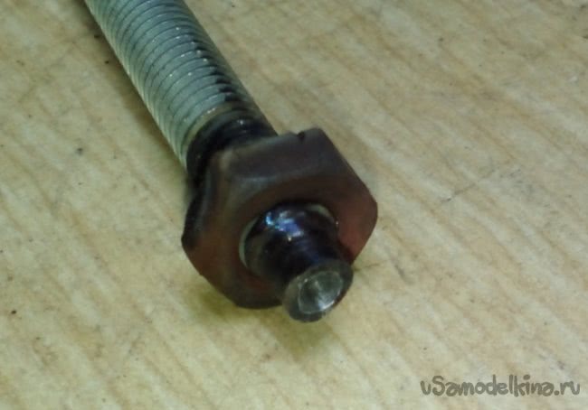 Зафиксируем гайку на винте точками сварки, что не даст ей отвернуться.