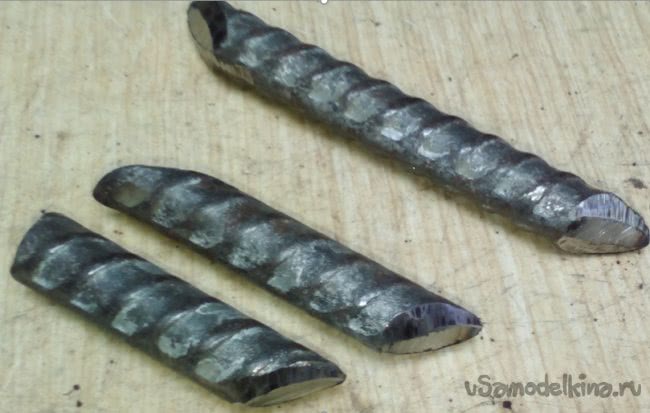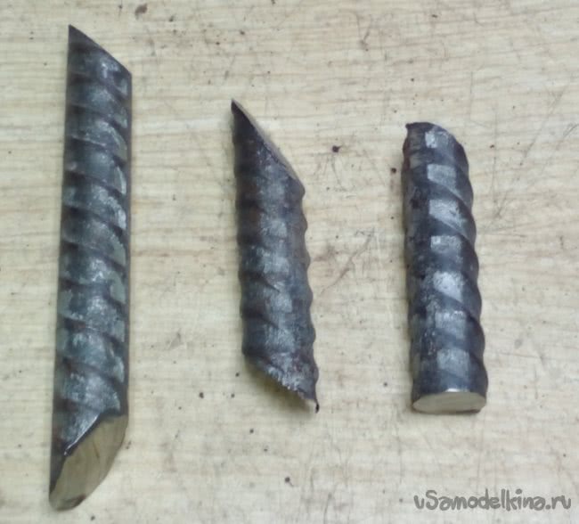Из подходящего по диаметру прутка арматуры болгаркой с отрезным диском нарезаем части корпуса струбцины как на фото в местах сварки под углом 45, в месте крепления винта под 90.