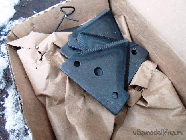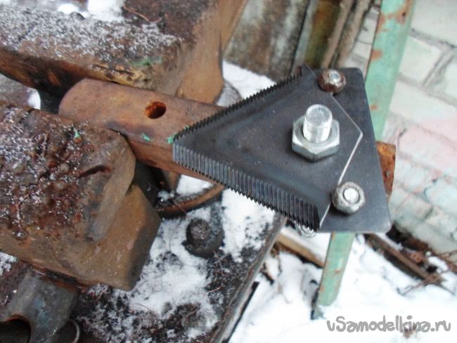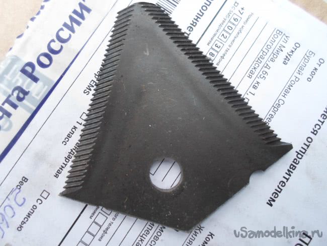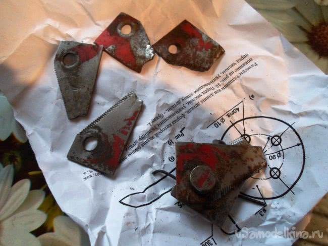 Кроме этого заменил сегменты на роторном диске. Купил сегменты от режущего аппарата комбайна «ДОН 1500». Просверлил отверстия диаметром 10мм. При помощи болгарки отрезал лишние части и получился вот такой сегмент.