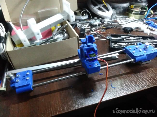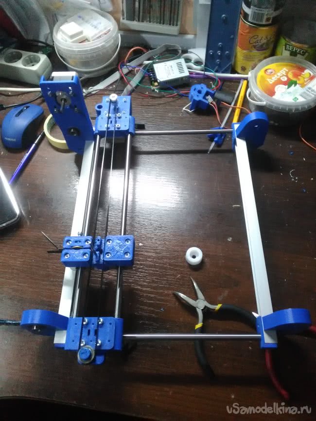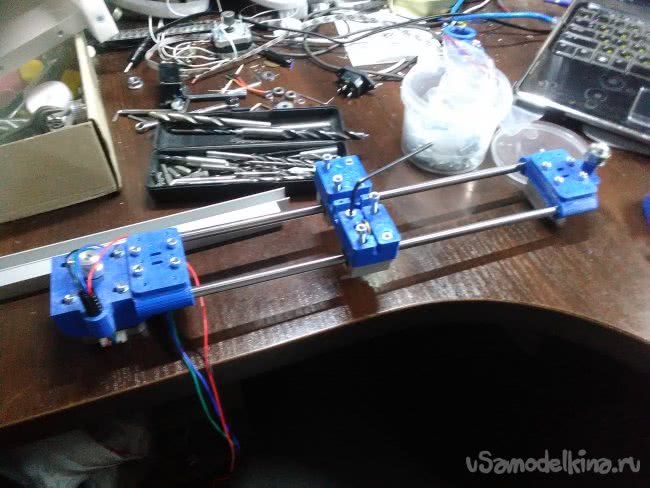 Первые попытки делал на мебельных направляющих и алюминиевых профилях. Тестировал работу первой сборки на листке бумаги ручкой.