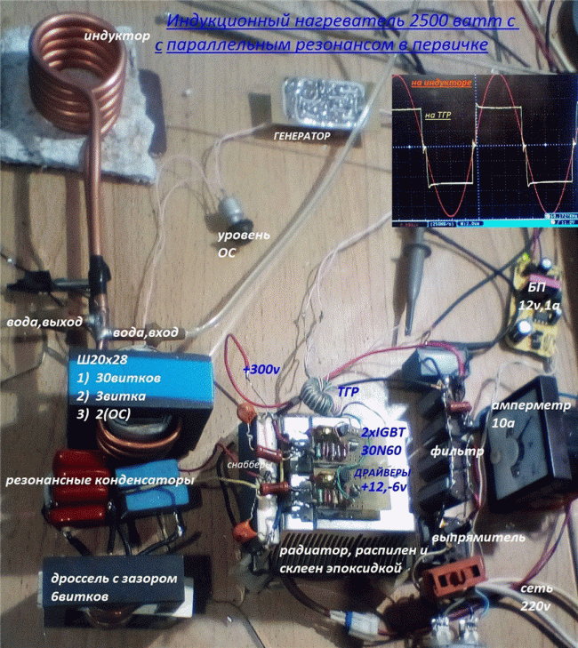 Полумостовой инвертор 2 - 4 квт для индукционного нагрева (плавки) металлов с параллельным резонансом в первичной обмотке согласующего трансформатора.