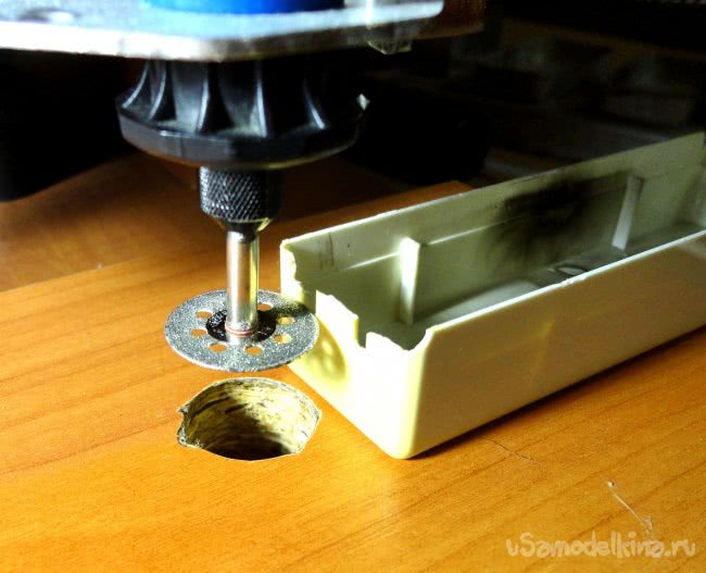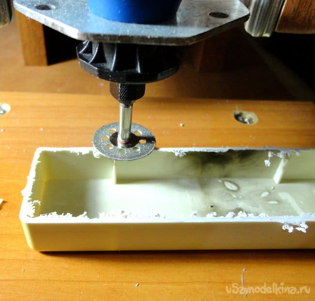 С помощью МФИ типа «Dremel» установленного в самодельный станок, верхняя часть корпуса была обрезана по краю отверстий для проводов. Сточены мешающиеся ребра. Надфилями подогнана нижняя часть корпуса.