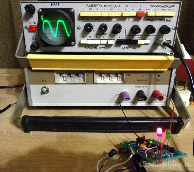 Поскольку в найденных мною в интернете схемах используются катушки с разной индуктивностью, в идею эксперимента входило заставить нормально работать две катушки с одинаковыми номиналами. По этому для начала схема собиралась и тестировалась на макетной плате. Настраивалась с использованием оборудования времен еще СССР.