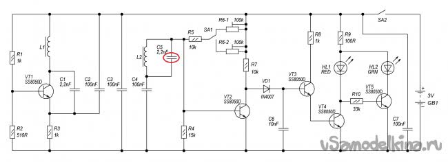 Используя метод «научного тыка», параллельно приемной катушке был установлен конденсатор C5 (который отсутствует в аналогичных схемах), исходя из идеи C5=C1. Который откорректировал приемный LC контур под рабочую частоту. В результате на приемной катушке поднялась амплитуда сигнала и выровнялась форма синусоиды, что значительно повысило чувствительность прибора.
