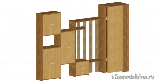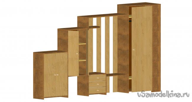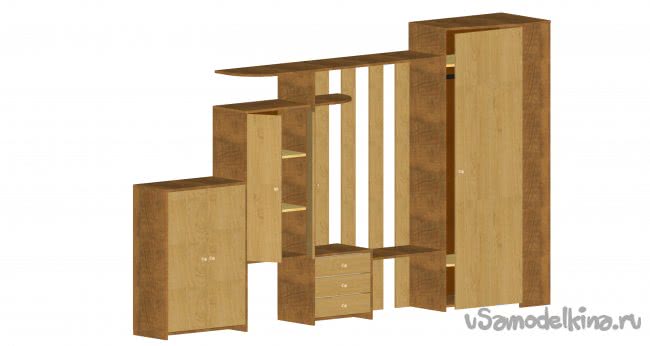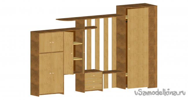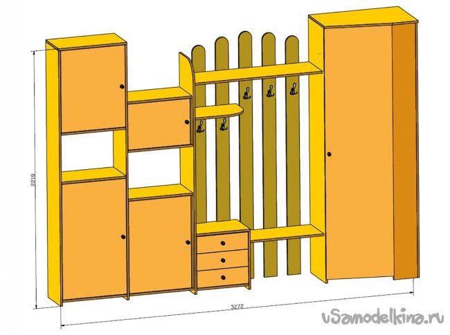 Собирается данная конструкция по месту, размеры могут варьироваться в зависимости от свободного пространства. На рисунках представлены различные варианты прихожей.