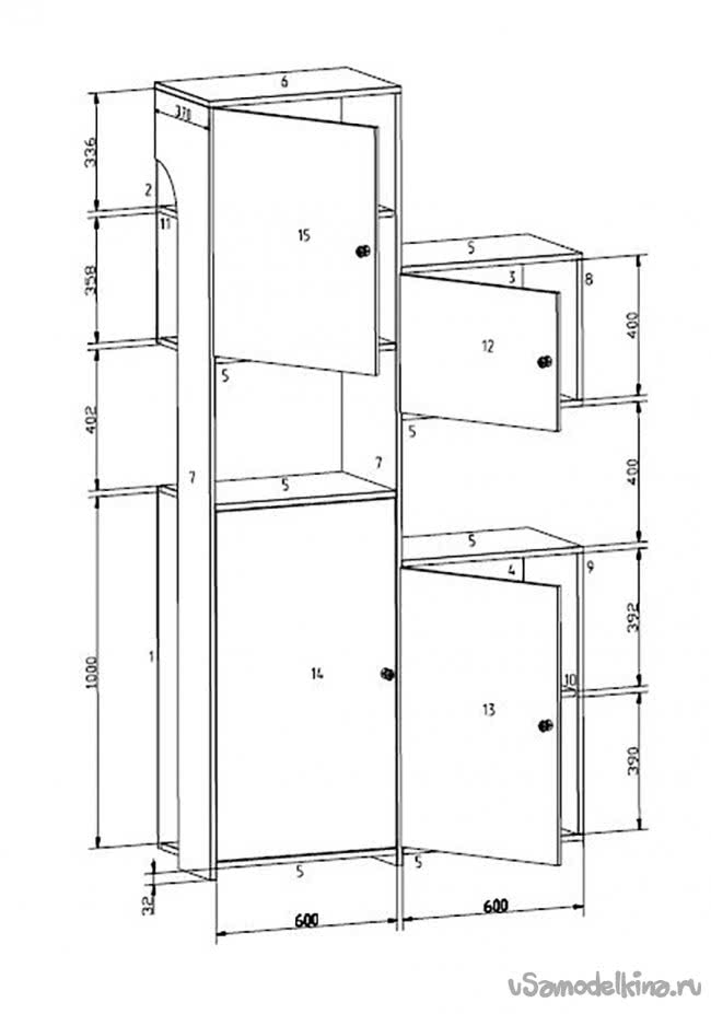 Шкафчики - самые простые предметы прихожей. Основой шкафчиков являются две стойки 7 высотой 2200 мм и шириной 370 мм, которые накрываются крышкой 6. Из панелей 5 и стоек 7, 8 и 9 образуются ниши, которые закрываются утопленными дверками 12, 13, 14 и 15, которые в закрытом положении фиксируются магнитными защёлками. Петли использованы рояльные. За дверками 13 и 15 на полкодержателях установлены дополнительные полки 10 и 11 глубиной 350 мм.