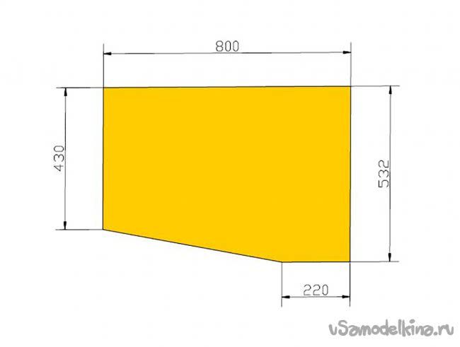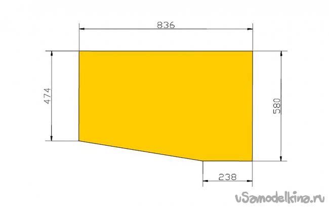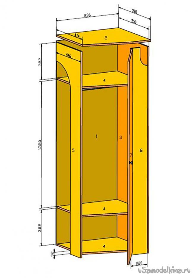 Основой шкафа являются две стойки 3 и 5 и лицевая панель 6 все высотой 2200 мм. Они накрываются крышкой 2, имеющей свес в 30 мм с лицевой стороны, чтобы закрыть накладную дверку 7. Чертёж крышки приведён на рисунке.