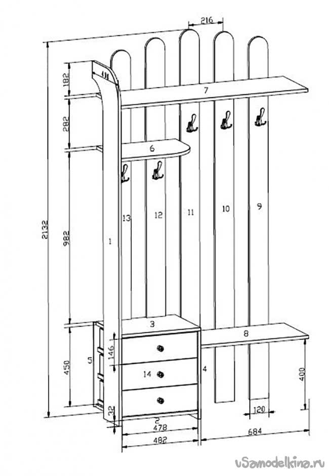 Конструкция вешалки посложнее. Хотел сделать её не только функциональной, но и чтобы был виден декоративный камень, которым облицованы стены прихожей. С этой целью решил сделать решётку из досок шириной 120 мм. Доски крепятся сзади к полкам 6, 7 и 8 и снизу к полке 3 тумбочки с ящиками. Сверху доски имеют скругление по R=60 мм. Слева вешалку ограничивает стойка 1, у которой скруглён верхний угол по R=200 мм. Полка 6 имеет такой же радиус скругления.