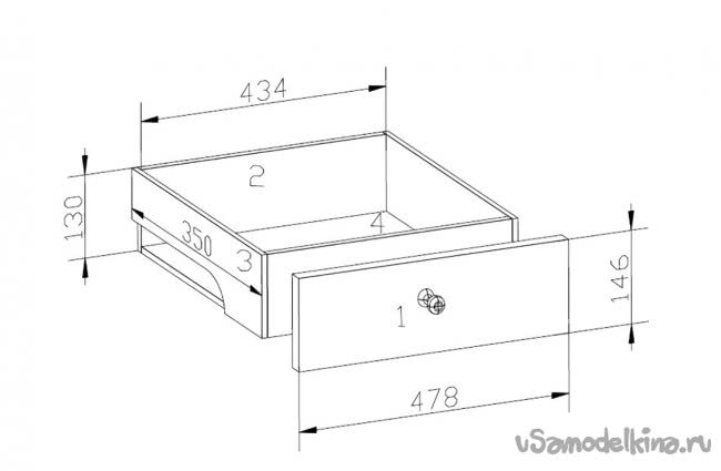 Панель 2, полка 3 и стойки 1, 4 образуют нишу для трёх ящиков, чертёж одного из которых представлен на рисунке.