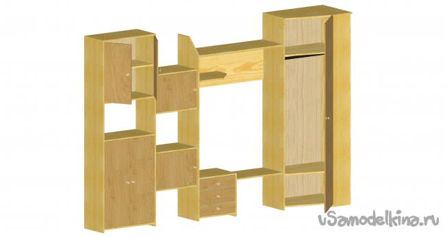 Комплект мебели надо было вписать в небольшое пространство (3275 мм - длиной и 2220 мм высотой) - это диктовали размеры свободной стены. Просмотрев в Интернете сайты по продаже мебельных щитов, я определился с окончательными размерами гарнитура - 3272х2218х580 мм, стараясь максимально использовать стандартные размеры щитов. Получилась неплохая, на мой взгляд, конструкция, которая отвечала всем поставленным требованиям.