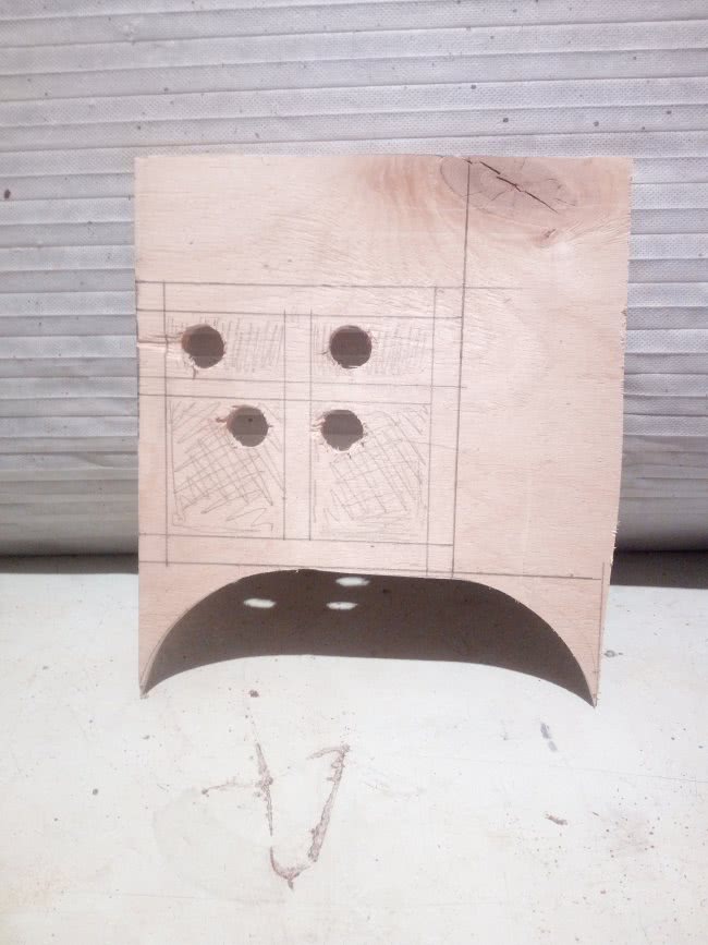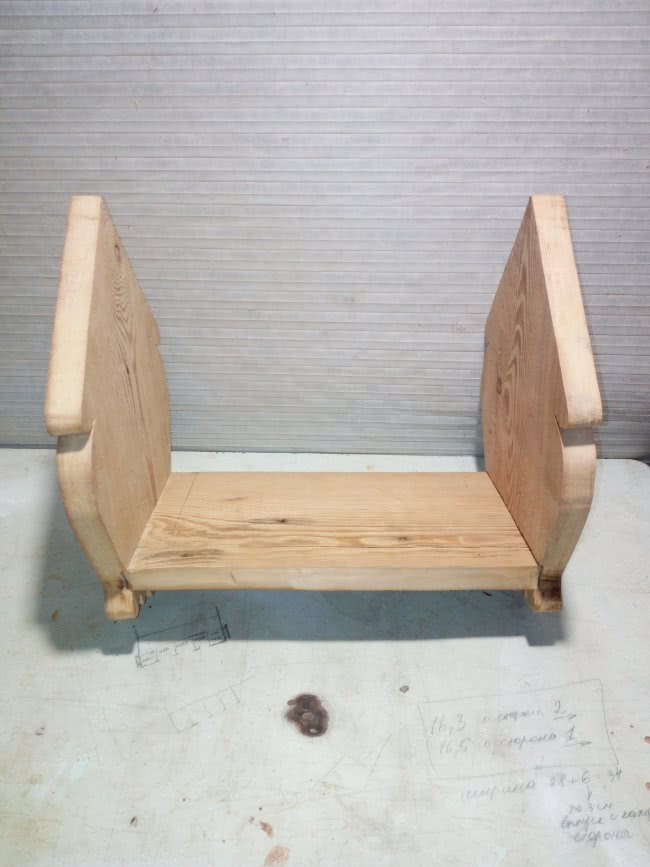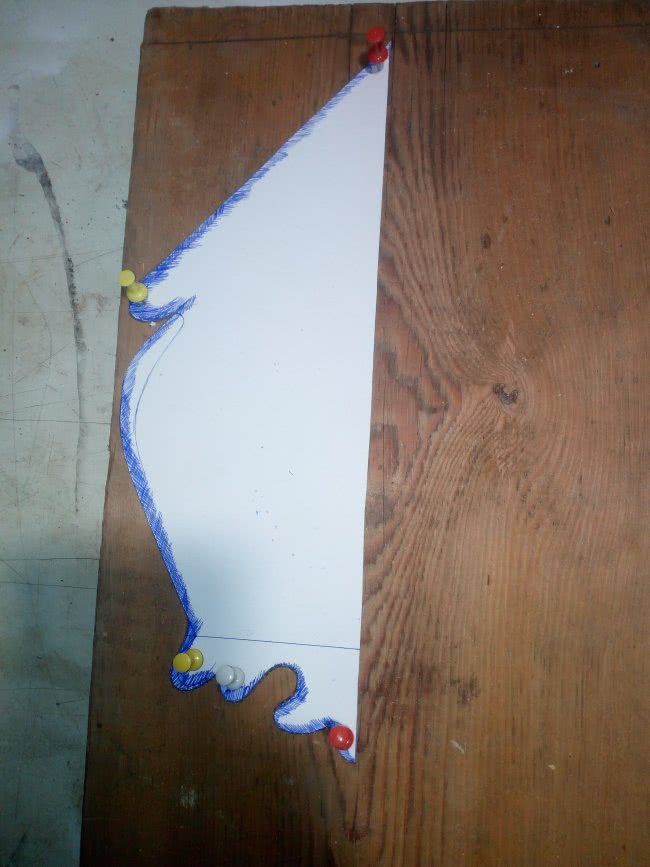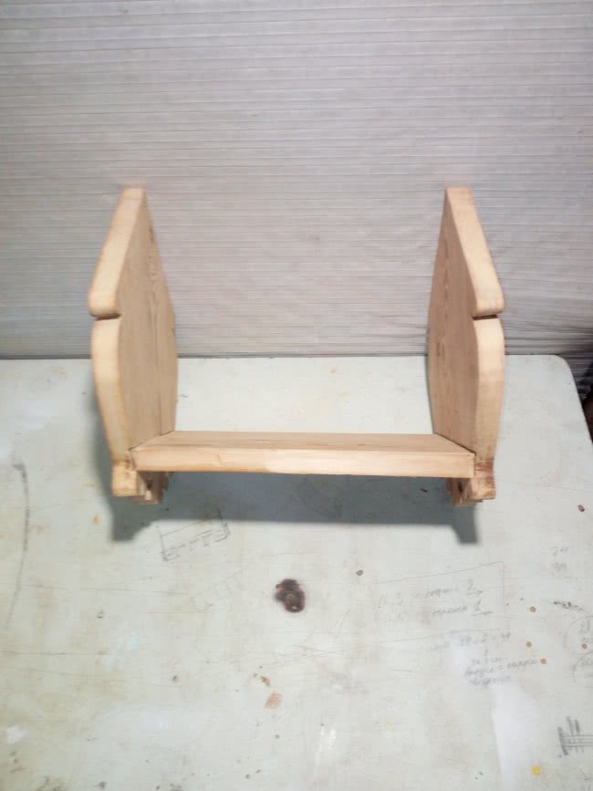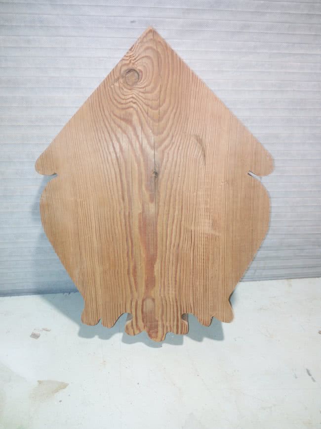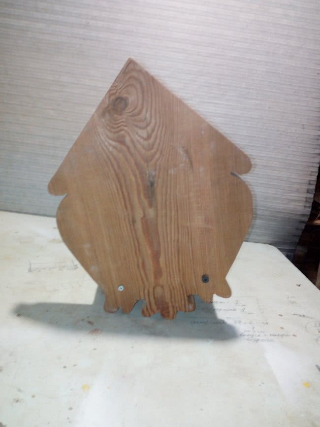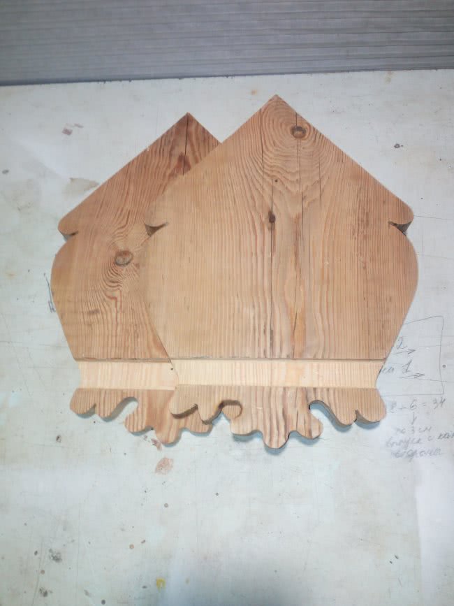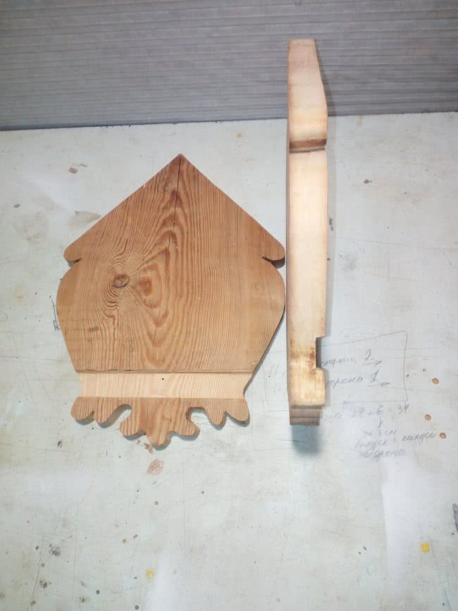 Чтобы кормушка прослужила более долгий срок, так как все таки находиться она постоянно будет на улице, не взирая на атмосферные осадки, ее основание я делал из доски, толщиной в 20 мм. Сначала на бумаге нарисовал полномасштабный шаблон. Вырезал его, закрепил на доске и обвел простым карандашом по контуру. Для экономии времени, а так же иметь возможность в итоге получить одинаковые детали, две доски, из которых будут выпиливаться боковые стенки изделия, я соединил между собой и уже после этого начал вырезать обе детали одновременно. Полученные заготовки отшлифовал. В тех местах где не смог нормально прорезать лобзиком, пришлось дорабатывать уже фрезами и дремелем. В итоге вот что получилось: