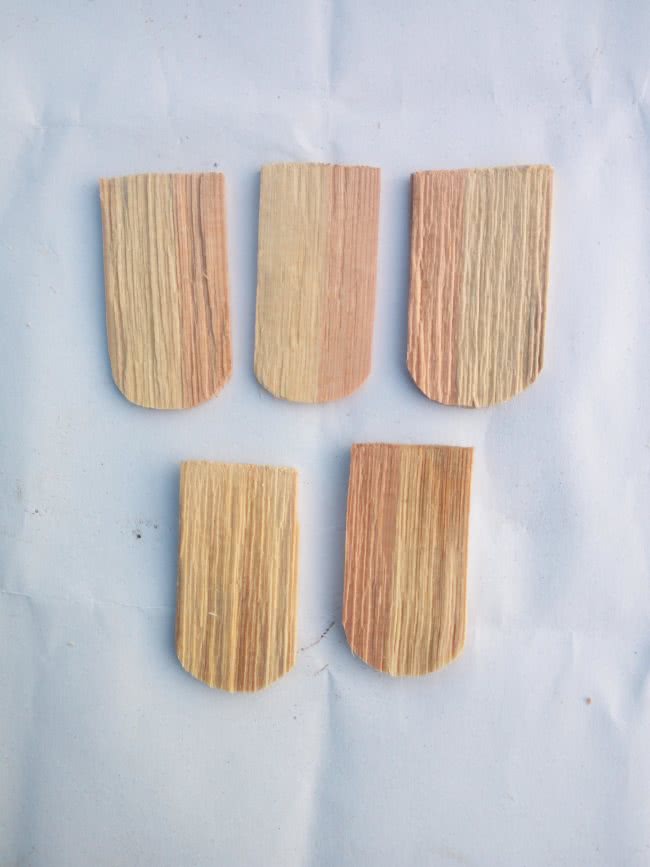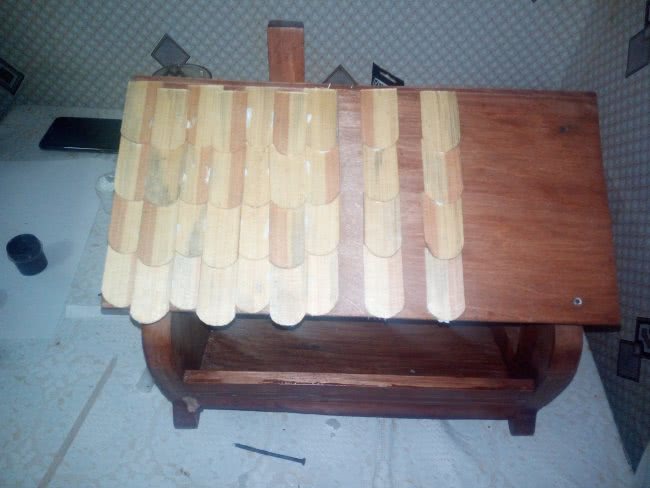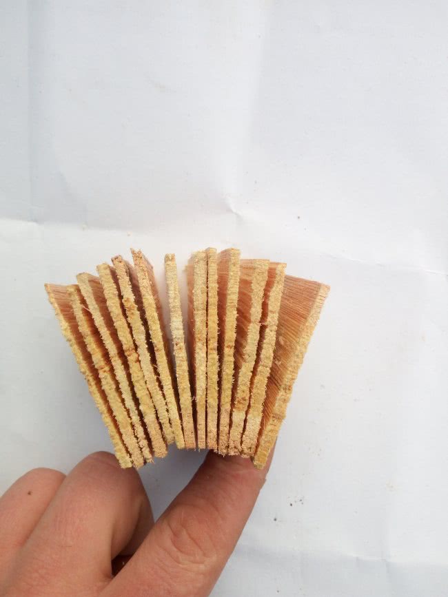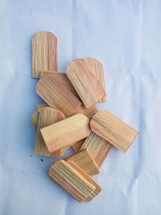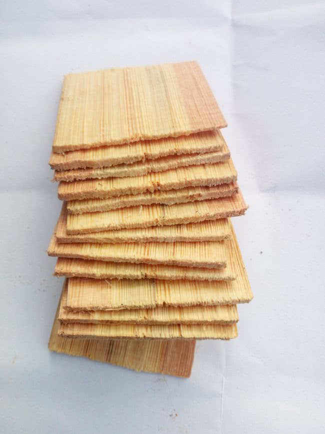 Описание проводимых работ буду делать в той же последовательности, как и делал все части кормушки. Поэтому сейчас описываю создание черепицы для крыши. Для ее изготовления я использовал сосновый брусок, который топором порубил на тонкие плашки. Их в свою очередь располовинил на две части каждую. Нарисовав на одной плашке нужную мне кромку черепицы, я использовал ее как шаблон для всех остальных. Весь процесс изготовления свелся к тому, что каждую плашку я просто-напросто с одного конца округлил канцелярским ножом. Благо толщина заготовок и то, что древесина была сырой сделать это оказалось достаточно легко. Далее был двухдневный процесс сушки. Они просто лежали на подносе на газовом котле. Просохли хорошо. Толщина черепиц не одинакова. После того как они просохли шлифовать детальки я не стал, решив что это придаст более натуральный вид готовому изделию.