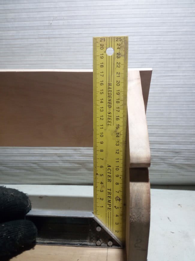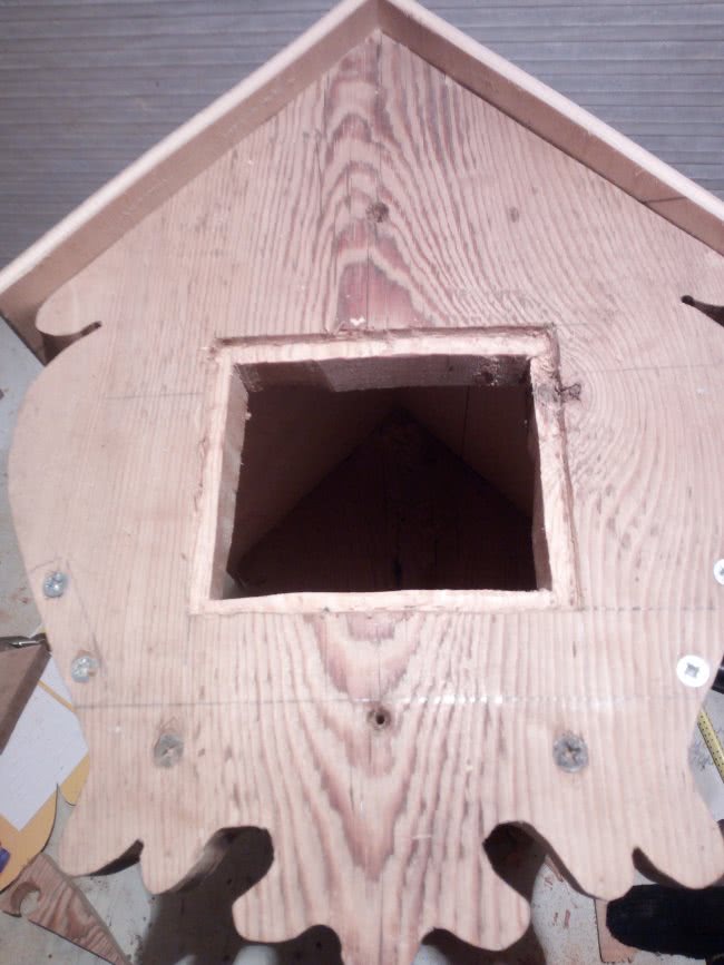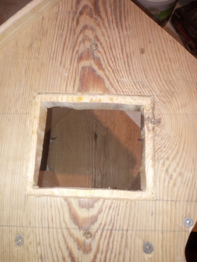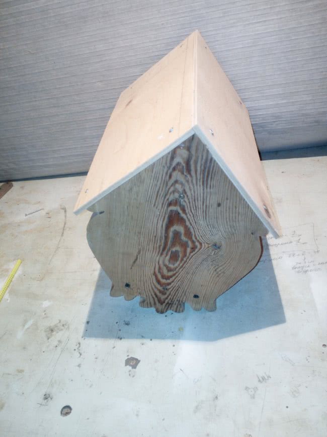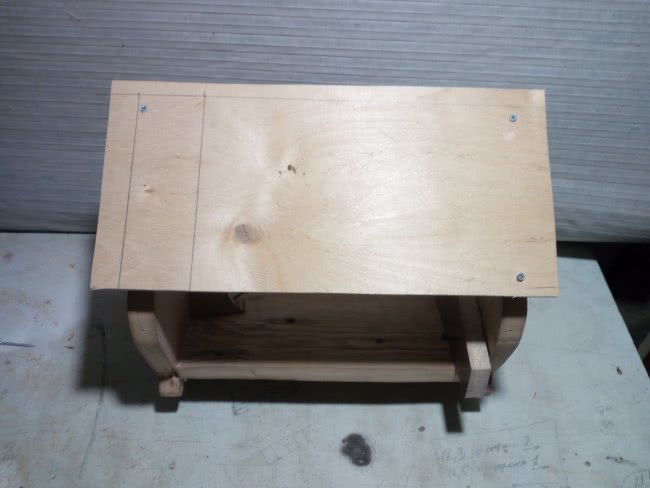 Далее приступил к изготовлению следующих частей, необходимых для окончательной сборки изделия. Дно я так же делал из 20-ти мм. доски. Отпилив заготовку необходимого мне размера я ее отшлифовал. На боковых стенках, в тех местах где должно будет устанавливаться дно, под его размеры я выбрал пазы. Пилой по металлу, для более аккуратного пропила, сделал разрезы. Стамеской выбрал все лишнее. Для удобства крепления боковин и дна, заранее в пазах сделал сквозные отверстия. Вставив в них саморезы с обратной стороны стенок, закрутил их в дно кормушки. Так как все отрезалось лобзиком, добиться идеального реза мне не удалось. Незначительное отклонение в одной из стенок от прямого угла все же наблюдалось. Эта проблема была решена при установке крыши. Ее я сделал из фанеры в 4 мм. К той стороне боковой стены где искривления не наблюдалось я фанерой притянул проблемную сторону. В итоге обе боковые стенки имели правильный угол. При закреплении крыши саморезы я вкручивал вровень с фанерой, чтобы шляпки не выступали над поверхностью. Чтобы избежать потерь корма сделал бортики. Их я делал из планки 10х40 мм. Под углом установил их во внутреннем пространстве кормушки. Чтобы избежать того, что при закручивании саморезов они могут расколоться, сначала сделал отверстия. Одновременно в стенках и бортиках. Только после этого окончательно установил и закрепил их на нужных местах.