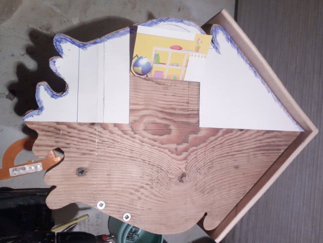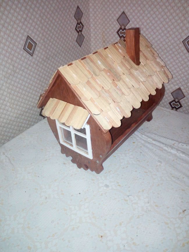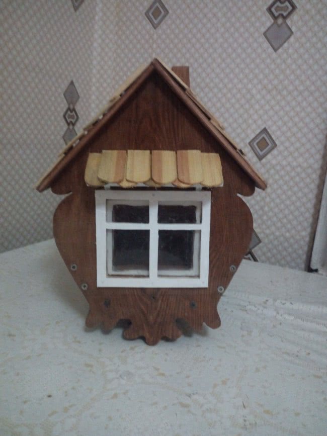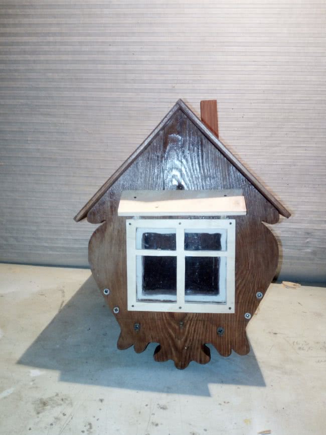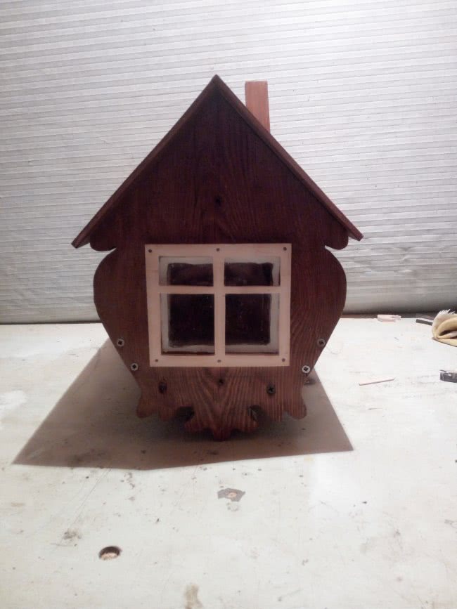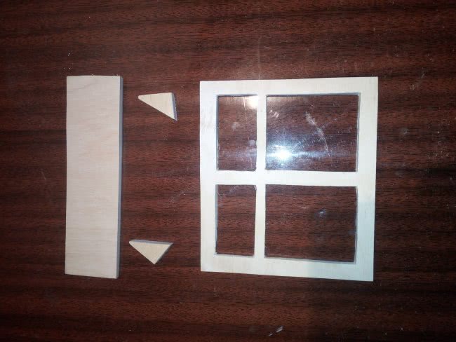 Изначально планировалось что на данном этапе, не считая черепицы, кормушка останется в таком виде. Но осмотрев еще раз практически готовую столовую, решил что чего-то не хватает. Это что-то стало окном. Опять использовал бумажный трафарет, вырезав в нем прямоугольник для разметки окна на одной из боковушек. Выпилив прямоугольное отверстие, заметил что внешний рез более прямой чем рез внутри. Там полотно уже гуляло как только можно. Причина оказалась в боковом опорном ролике, который слетел со своего места. Подровняв как только это возможно пропил, сделал по его краям посадочное углубление для стекла. На крышу установил брусок играющий роль печной трубы. мне кажется что так избушка имеет более интересный вид. Затем приступил к изготовлению рамы для окошка. Из той же фанеры в 4 мм. ее и выпилил. Так же выпилил козырек, который установится над окном и опорные уголки для него.