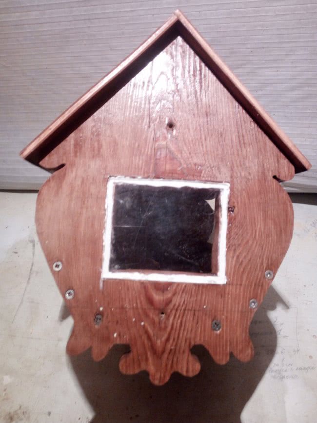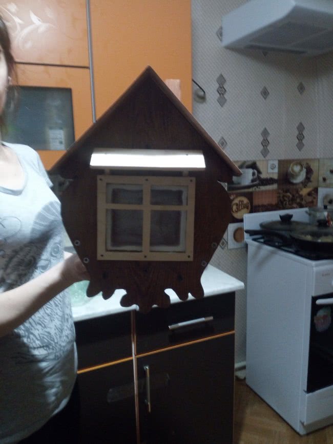 Всю конструкцию покрыл лаком. Приступаю к установке оргстекла в оконный проем. Смазываю углубление в раме силиконовым аквариумным герметиком и вставляю туда стекло. Поверх него устанавливаю имитацию рамы. Крепил ее гвоздями в 10 мм по кругу. Закрепленная рама плотнее прижала стекло к стенке. Креплю опорные уголки и на них козырек.