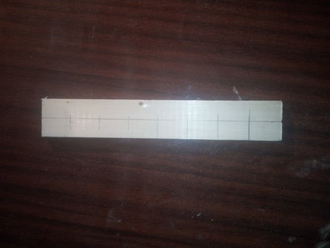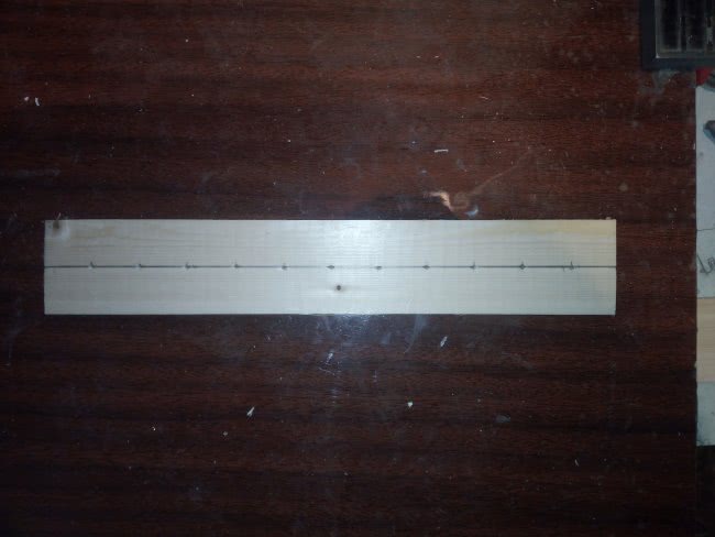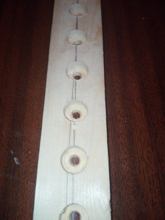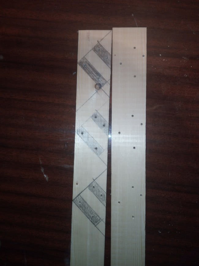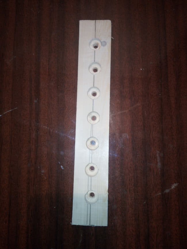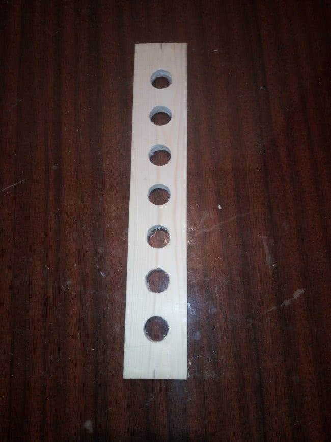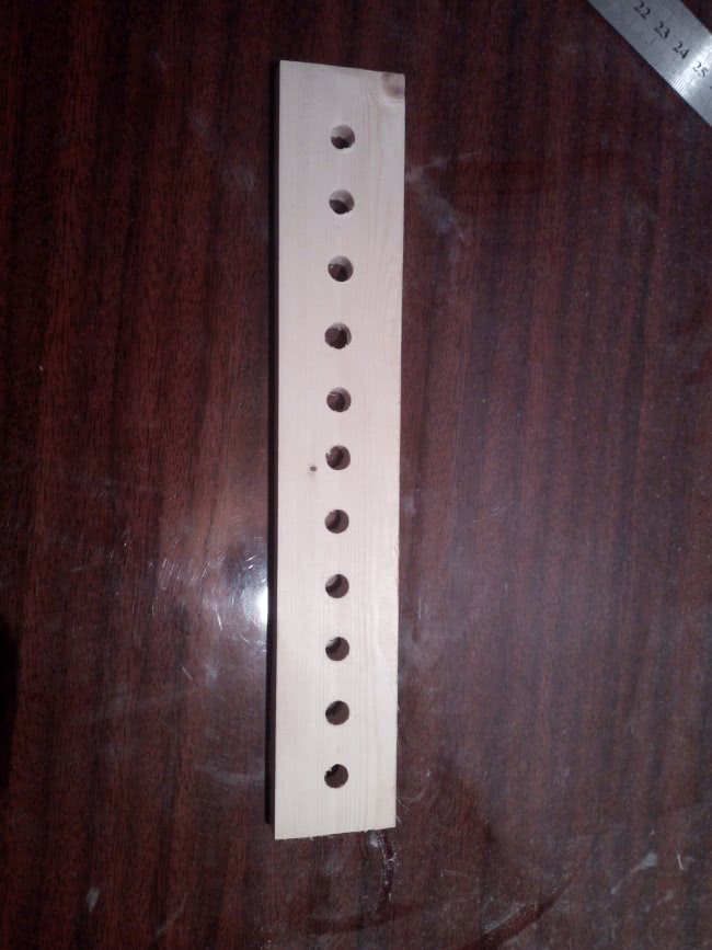 Основой для полки послужила рейка размером 40х10 мм. Отпилив нужные мне по размеру куски, я наметил в них места для отверстий. Всего мне понадобилось 7 поперечный реек и две продольные, для боковин. В отмеченных местах, с помощью перового сверла в трех рейках я делаю сквозные отверстия. В трех оставшихся - отверстия уже не сквозные, а примерно 2/3 от толщины планки. В моем случае это около 6-7 мм. Забегая вперед скажу, что в эти отверстия будут вставлены пластмассовые трубки.