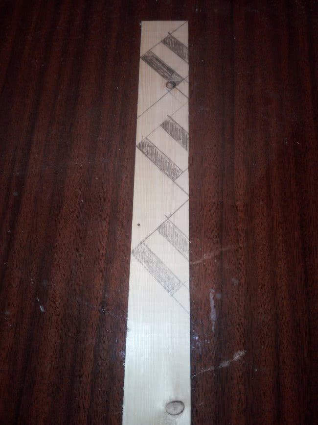 Далее, эти детали нужно будет установить на продольные планки, выполняющие роль боковых опорных стенок всей полки. По моей задумке планки с отверстиями должны находиться под углом относительно боковых стенок. Это уменьшит размер самой полки, т.к. не нужно будет делать большое расстояние между планками чтобы доставать и вставлять сверла. Они не будут упираться в вышестоящую планку. Поэтому на боковинках я делаю разметку того, как будут располагаться поперечные рейки. Для этого использую угольник. Делаю угол в 45 градусов. От вершины этого угла провожу еще один, но уже в противоположном направлении. Затем делаю разметку под сами планки. Чтобы просверлить отверстия под саморезы так, чтобы они были на одном уровне, прикладываю детали друг к другу и плотно фиксирую их струбцинами. Сверлю отверстия в местах крепления поперечин.С отверстиями намного удобнее производить процесс сборки. Да и планки не треснут при закручивании в них саморезов, особенно торцевые. Начинаю собирать детали.