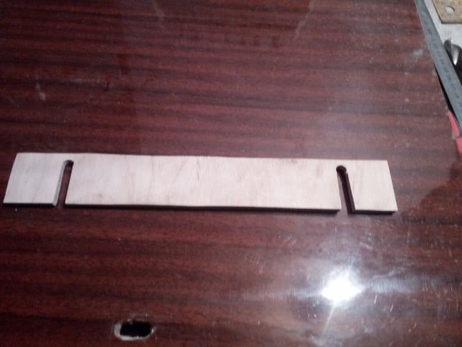 Чтобы полка имела законченный вид, не пропадало полезное пространство, да и для большей прочности, отрезаю еще одну планку, которая будет крепиться в самом низу. в ней так же делаю сквозные отверстия. Из фанеры вырезаю планку, в которой делаю пропилы с двух сторон. Эта часть с помощью которой полка будет крепиться к поверхности стены.