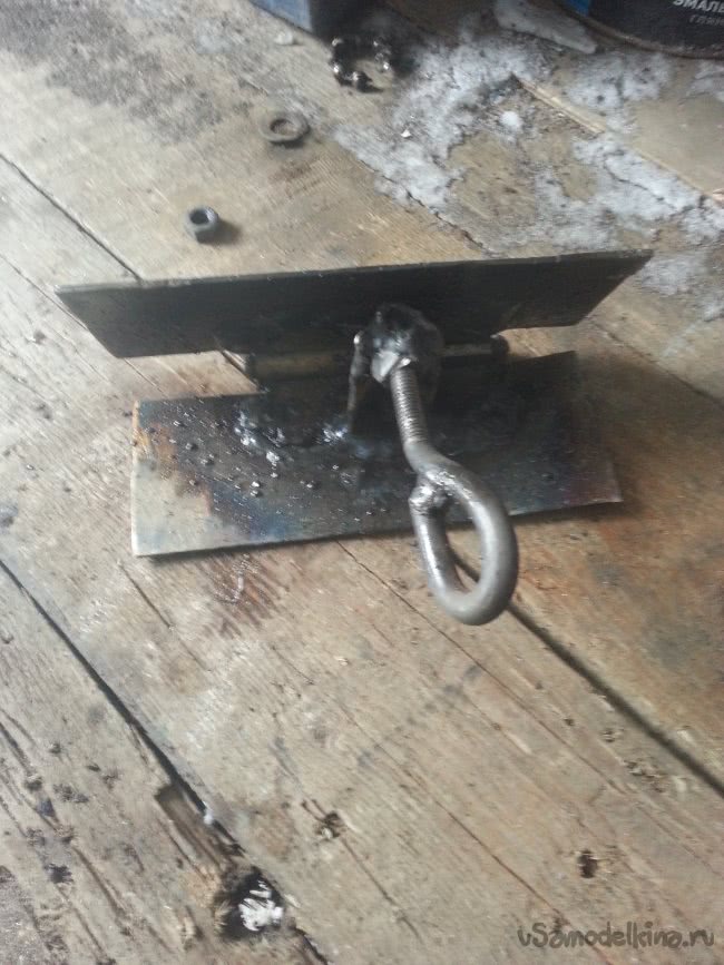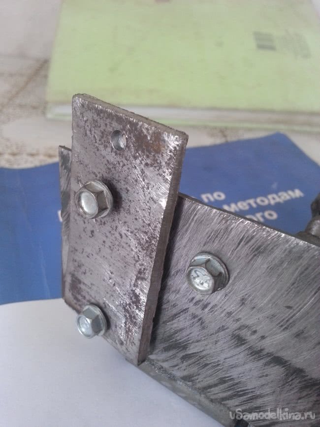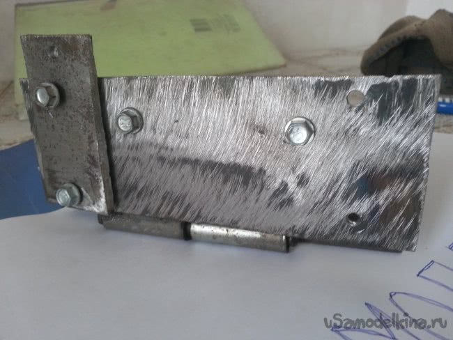 Далее привариваю к пластинам, за сварку прошу прощения - сколько раз вы меня ругали здесь, так и не научился варить, ну а пока так сойдет главное, держится. Теперь нужен какой-нибудь механизм, чтобы наша площадка регулировала угол шлифовки - для этих целей взял кусочек уголочка 4 см, и от центровав приварил к нему 2 гайки м6. И приварил к площадке примерно на нужное место. Для регулировки взял из проволоки шестерки сделал крючок, нарезал резьбу, примерил понравиться так и оставил.