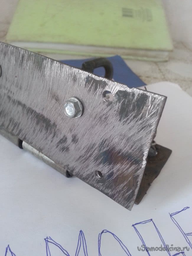 Для крепления лезвия я использую струбцину. Для крепления сначала сделал по два с каждого края отверстия и нашёл небольшой кусочек металла 3мм, просверлил отверстия и все крепил на болты - очень даже надежно зажимает. Но часто приходилось откручивать болты, и решил пользоваться струбциной. Ну вот и все, инструмент готов.