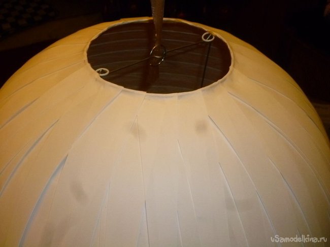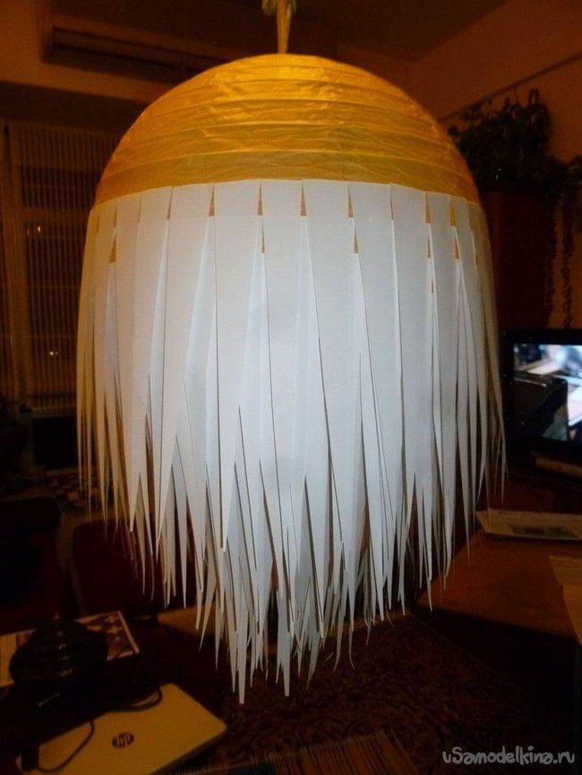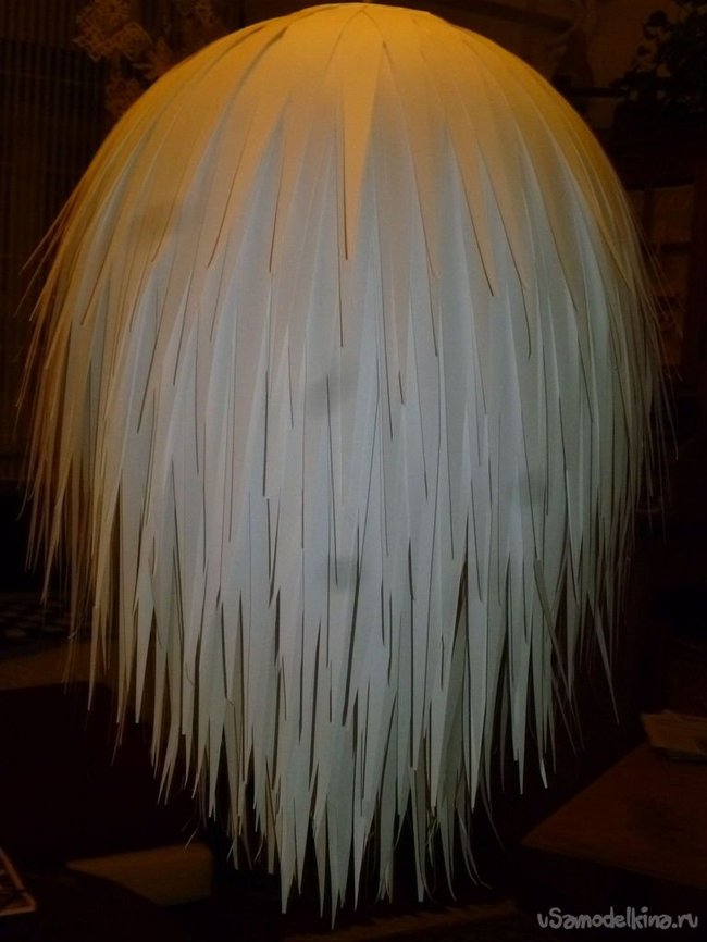 Хоть этот светильник и требует терпения, времени у вас уйдет не очень много. Как только вы достигли верха лампы, убедитесь, что бумажные полосы покрыли ее полностью, безо всяких пробелов, через которые просвечивает фонарик. Как по мне, тогда поделка смотрится лучше, так что я наклеила несколько полос поверх основного слоя, чтобы замаскировать свои промахи. Где-то на середине лампы я обнаружила, что будет удобнее доделывать ее в подвешенном состоянии. Так полоски не будут загибаться или случайно рваться.