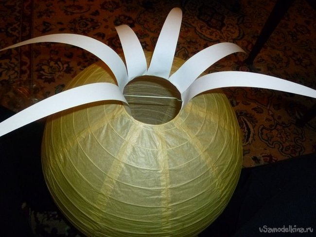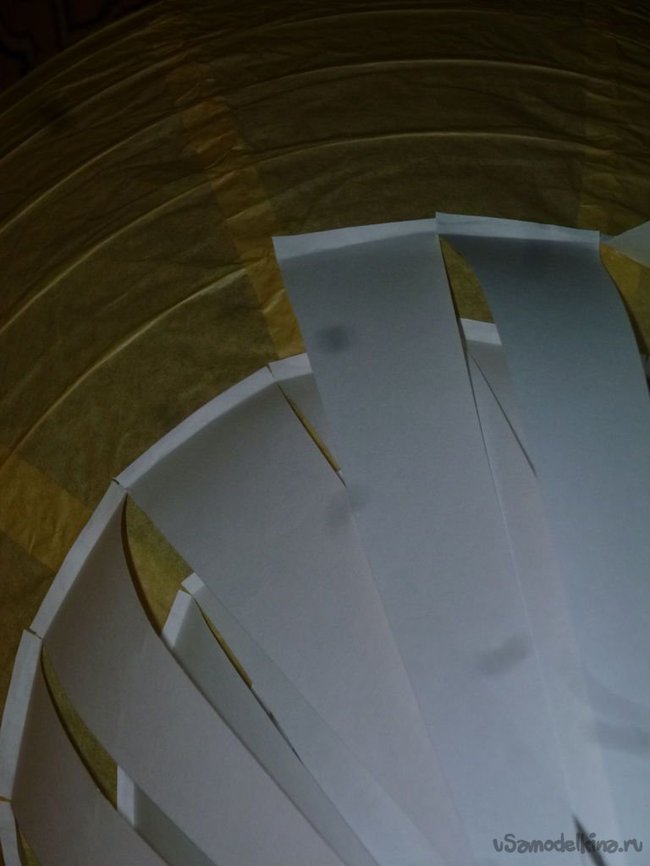 Я приклеила первый круг полосок внутри нижнего разреза фонарика. Затем я перевернула фонарь верх ногами и клеила остальные слои полосок уже с внешней стороны. Самый нижний слой полосок нужно согнуть, так чтобы они больше смотрели вниз, чем вовнутрь. Клей нужно наносить на крошечную верхнюю полоску каждой бумажки, так как остальная часть будет просто свисать.