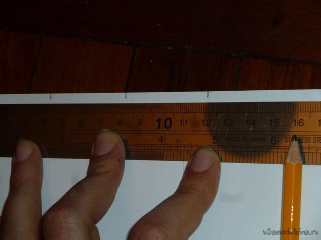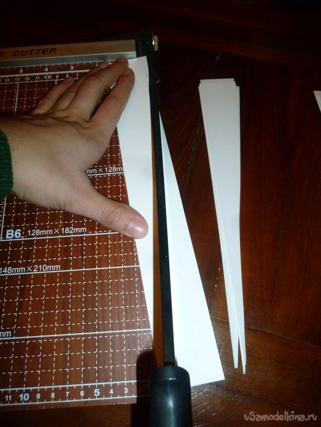 Я взяла простой бумажный фонарик желтого цвета из Ikea. На бумажных листах А3 я разметила каждые 2 см, и затем разрезала на полоски удобной машинкой для резки. Полоски 4 см в ширину и 11 см в длину были разрезаны на треугольники - я просто разрезала каждую полосу по диагонали. Их несимметричность не играет большой роли, так как у нас будет множество слоев, и все мелкие недочеты будут скрыты.