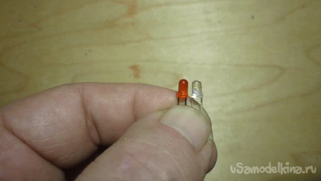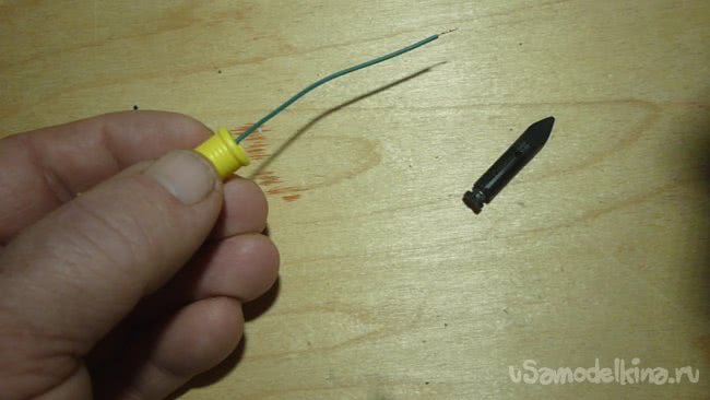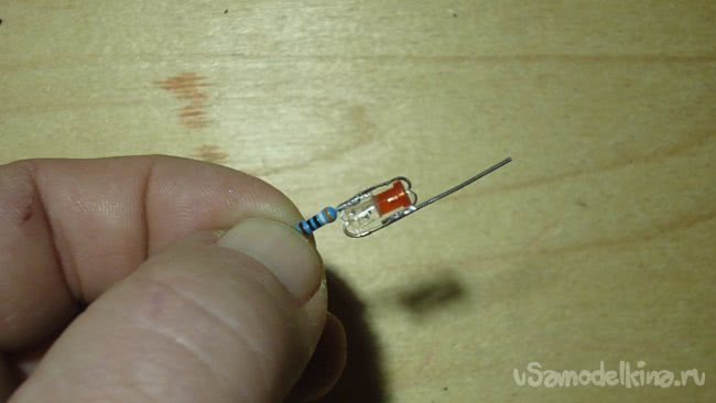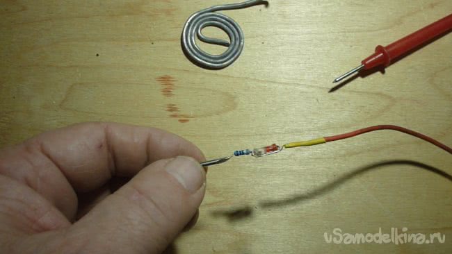 7. К блоку светодиодов с одной стороны припаиваем резистор 300-400 ом. И контакт из тонкой металлической трубки, с другой стороны припаиваем провод с электрическим щупом.