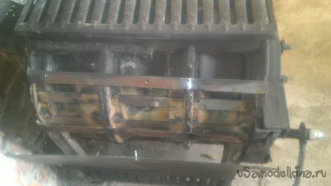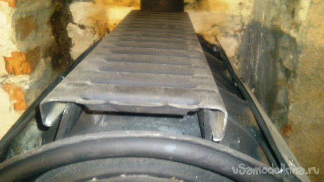 Сверху я приварил вдоль две полосы, сделав в них нужные вырезы и положил на них одну из моих ржавых решёток. Она касается "покрасневших рёбер", и эффективно отводит с них тепло: