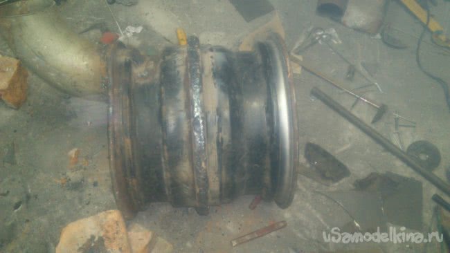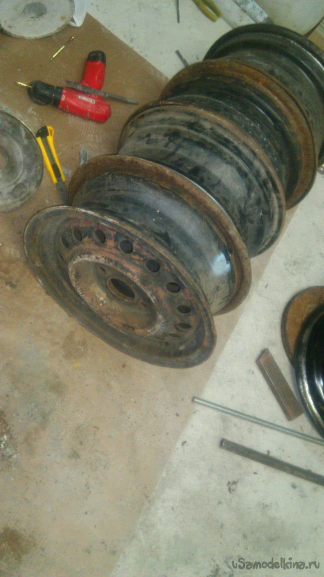 А пока я решил в него-же запустить дымоход "буржуйки". Так как предполагалась временная простая конструкция, сделать её я решил из старых четырнадцатидюймовых колёсных дисков, которые остались у меня от бывших моих машин: