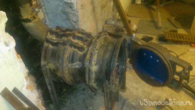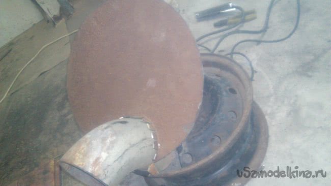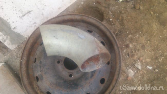 Я когда-то споткнулся об него, подобрал... и лет десять оно лежало и ждало своего часа.))). Его я решил использовать для вывода дыма из топки. Сначала я взял один из дисков, и вырезал в нём грубое отверстие: