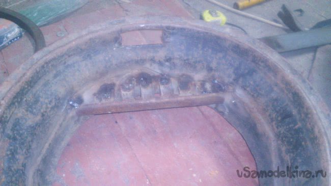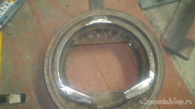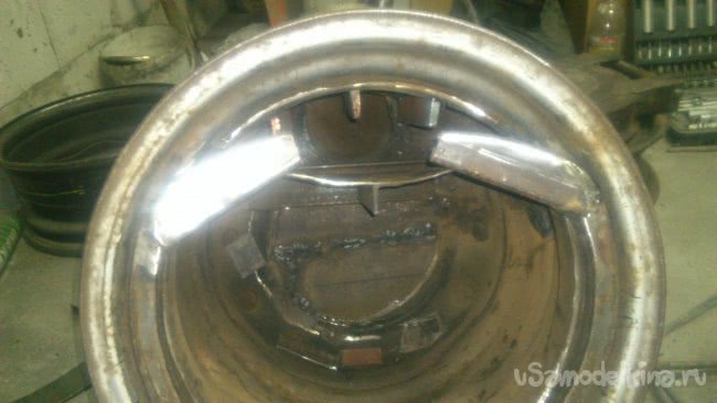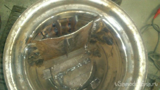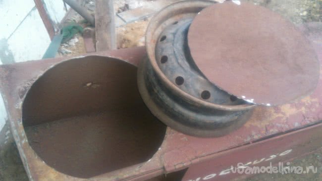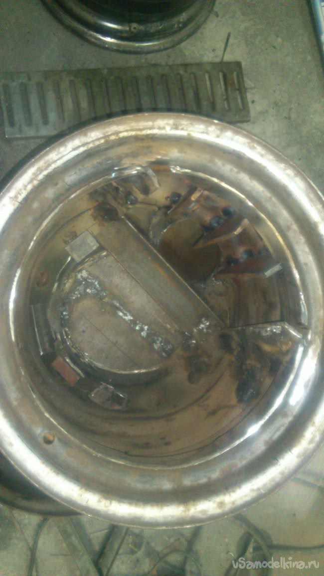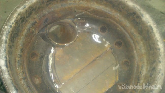 Именно потому, что стенка будет относительно тонкой, а в неё, раскалённую, будут наноситься дровами удары, я решил не вырезать полностью внутренность колёсного диска. Какая ни есть, а механическая защита.