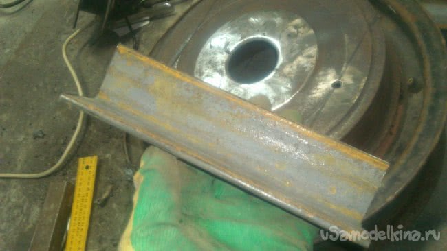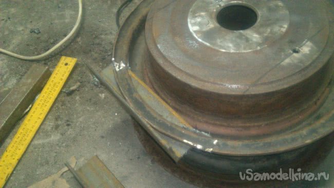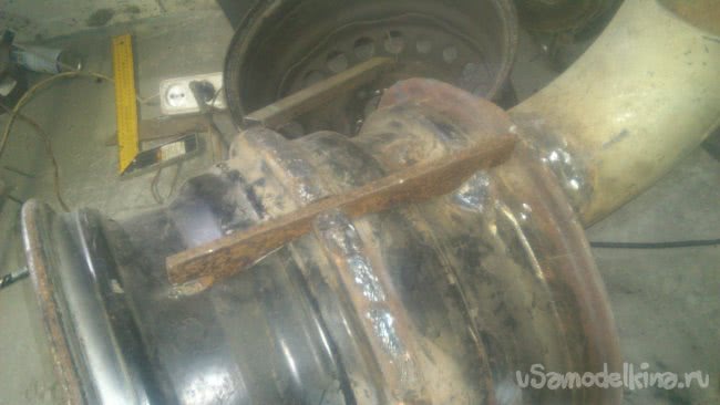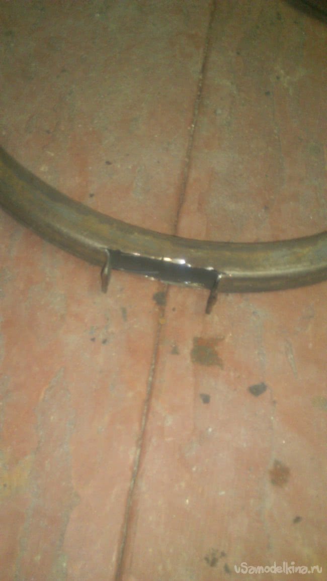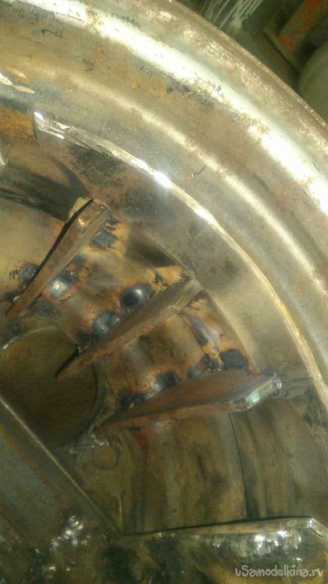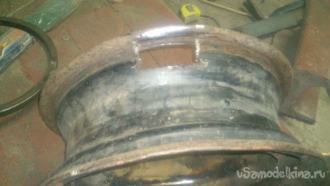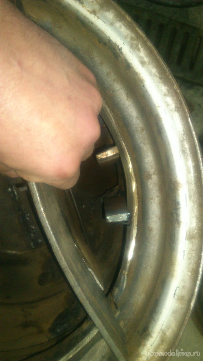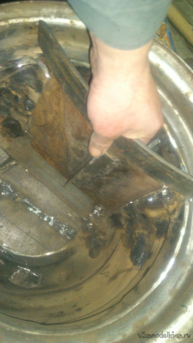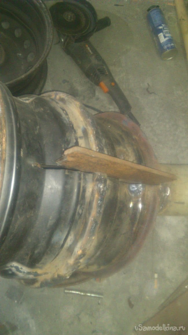 оставались пластины стали, толщиной 4 мм. (Тогда, для изготовления скрытых петель, мне приходилось вырезать стенки профильной трубы большого сечения). Вот их я и решил использовать. И, вырезав нужную форму, заварил ими большое отверстие в колёсном диске, образовавшееся после вырезания внутренней, сильно выступающей части: