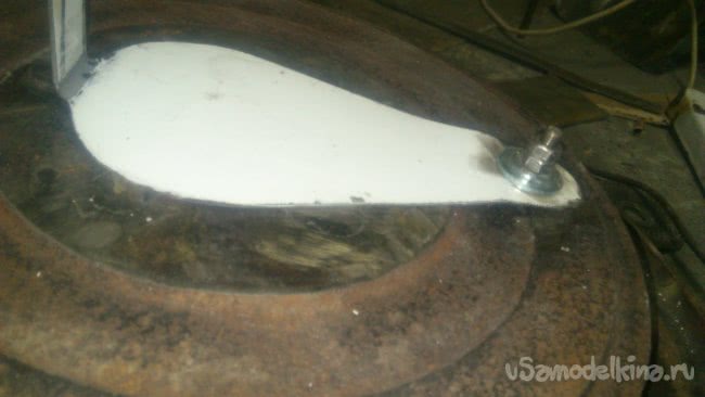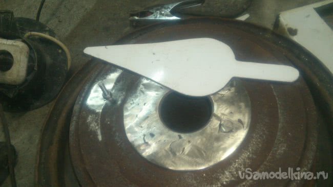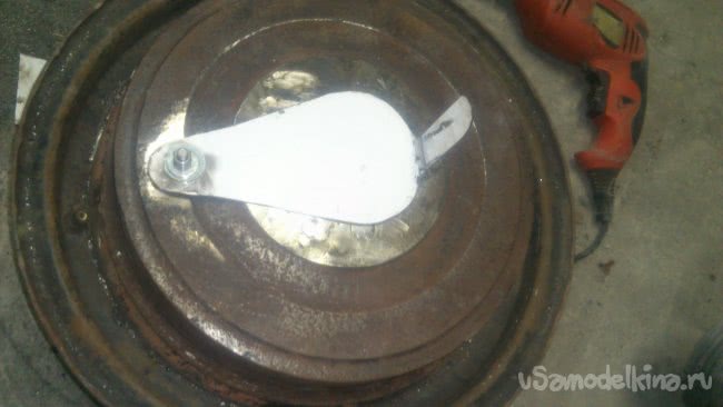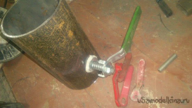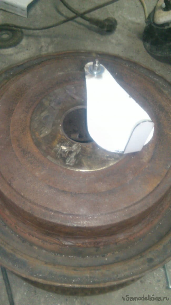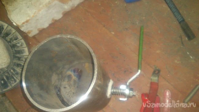Винт, на котором потом закреплю заслонку, с обратной стороны я приварил к барабану. А саму заслонку я вырезал из остатков старой газовой плиты.