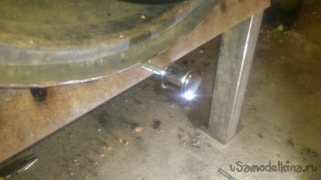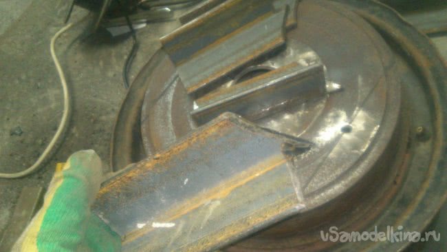 В колёсном диске я сделал прорези и тоже вложил в них и приварил такие-же уголки так, чтобы вместе с приваренными к люку, они образовывали прямоугольник: