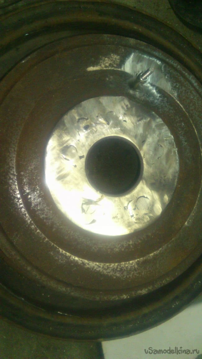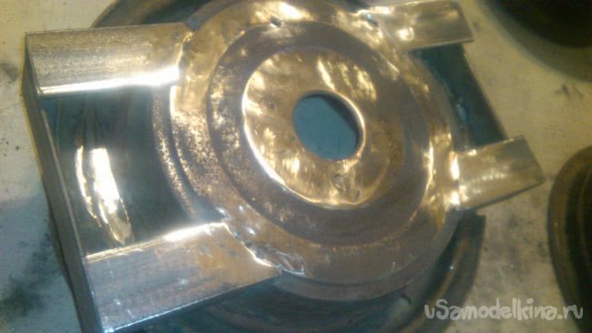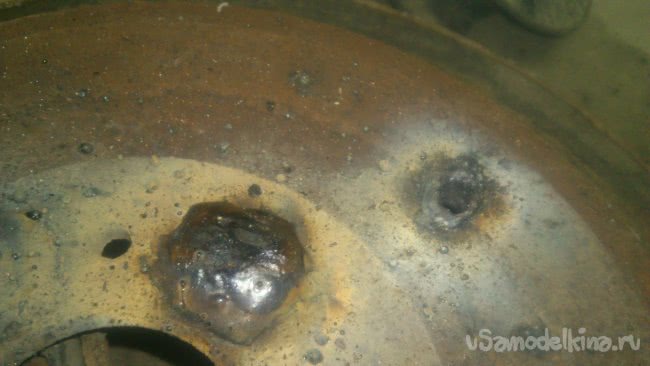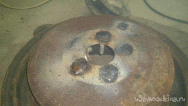 Ступичное отверстие я решил использовать в качестве поддувала, а отверстия под болты - заварить. Болтами и заварил!))) Вложил в них старые болты и расплавил сваркой шляпки: