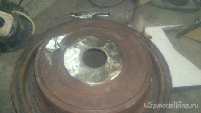 Люк для загрузки топки топливом я решил сделать из тормозного барабана от минивэна: