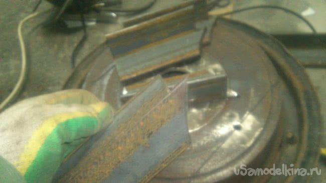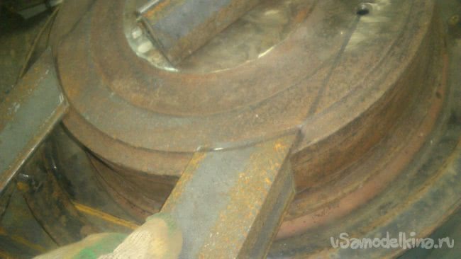 Кроме этого я решил сделать кожухи, которые направляли бы конвекционные потоки ближе к корпусу. Для их крепления по внешним бортам дисков я пустил несколько полос 25х4. А в нижней части сделал перемычку между ножками их профильной трубы 15х15.
