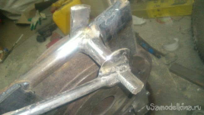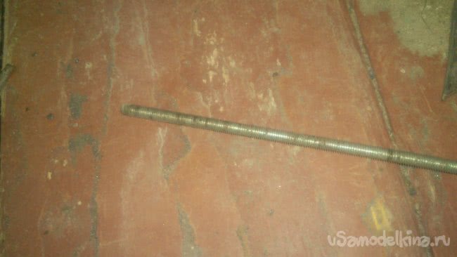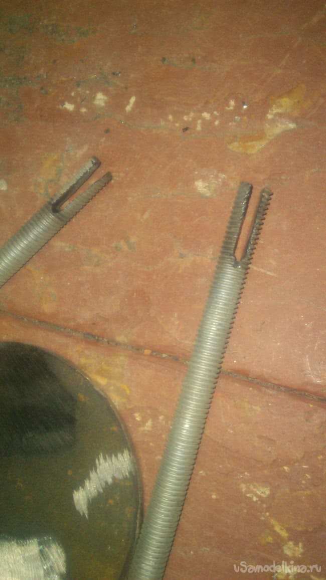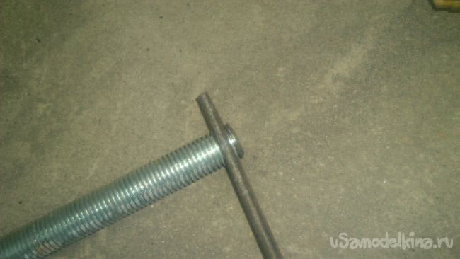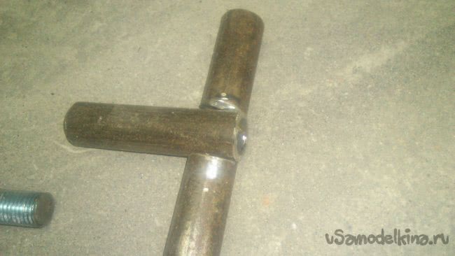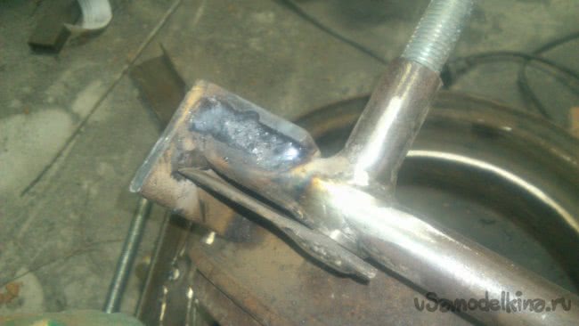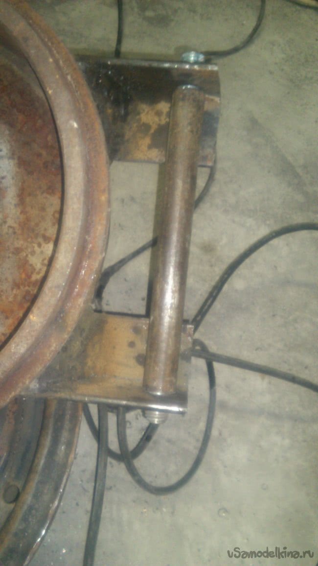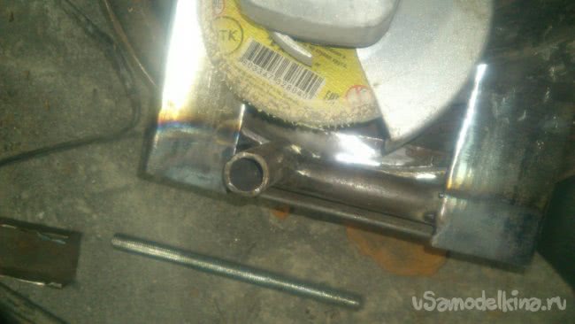 С правой стороны я просверлил отверстия и пропустил через них отрезок шпильки М16 (Осталась после изготовления петель люка). На неё одел отрезок водопроводной трубы ДУ15, которую потом приварю к диску. Получится крепкая дверная петля.